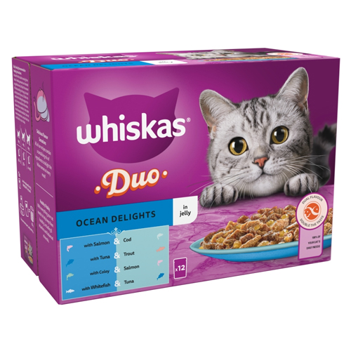 WHISKAS 1+ CAT POUCHES DUO OCEAN DELIGHTS IN JELLY 12PK 85G