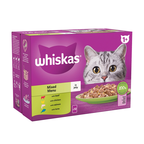 WHISKAS 1 + CAT POUCHES MIXED MENU IN JELLY 12PK 85G