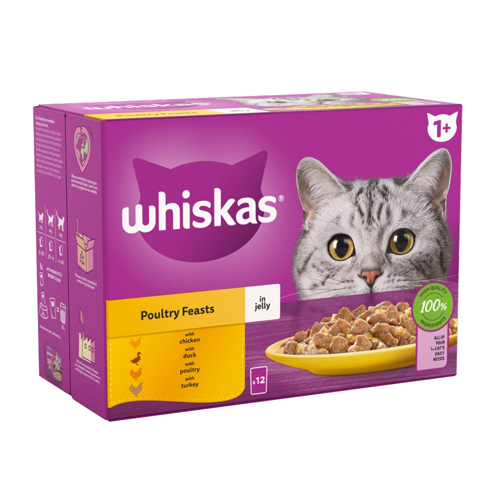 WHISKAS 1+ CAT POUCHES POULY FREASTS IN JELLY 12PK 85G